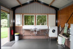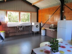 Het kleine huisje is de buitenkeuken. Daarin bevind zich een aanrecht met dubbele afwasplek, wasmachine en centrifuge. Voor wandelaars en fietsers hebben we als extra service een koel/vries combinatie, kookstel op gas en een tafel en stoelen om aan te eten.